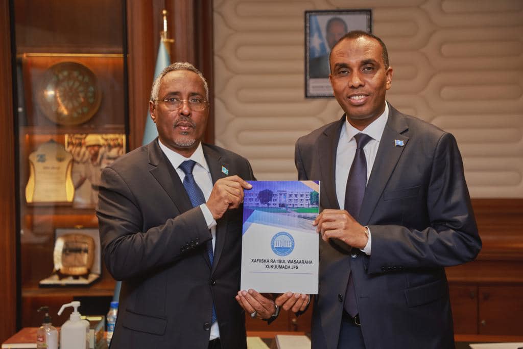 Muqdisho (Lamaane.net)- Wasiirka Arrimaha Dibadda iyo Iskaashiga Caalamiga, Mudane Abshir Cumar Jaamac ayaa maanta oo Khamiis ah u gudbiyay Raiisul Wasaaraha Xukuumadda Federaalka Soomaaliya, Mudane Xamse Cabdi Barre, ballanqaadka qorshe hawleedka Wasaaradda Arrimaha Dibadda iyo Iskaashiga Caalamiga ah ee sanadka 2023.