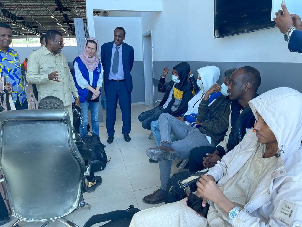 Muqdisho (Lamaane.net) - Xoghayaha Joogtada Wasaaradda Arrimaha Dibadda iyo Iskaashiga Caalamiga, Mudane Xamse Aadan Xaadoow, ayaa maanta ku soo dhoweeyay Gegidda diyaaradaha caalamiga ee Aadan Cabdulle ee Caasimadda Muqdisho, sagaal (9) muwaadin oo Soomaaliyeed oo dib loogu soo celiyay dalka kadib muddo sanado ah oo ay ku xayirnaayeen dalka Liibiya.