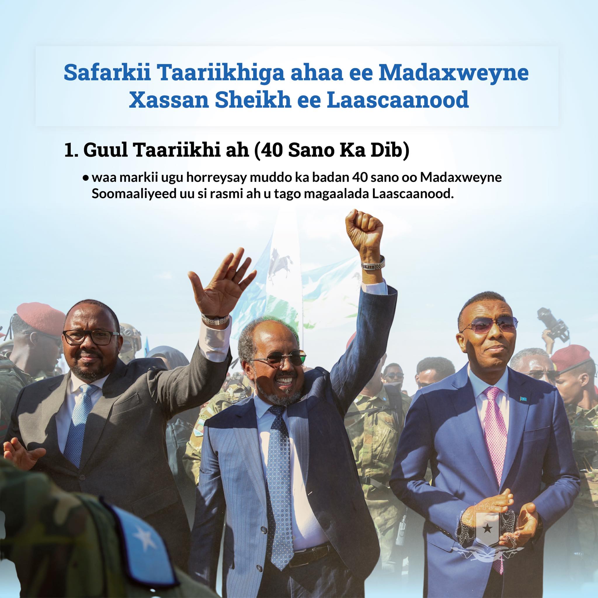 Muqdisho (Lamaane.net) - Safarka Madaxweynaha Jamhuuriyadda Federaalka Soomaaliya, Mudane Xasan Sheekh Maxamuud, uu ku tagay magaalada Laasacaanood, xarunta Dowlad-goboleedka Waqooyi Bari, ayaa ahaa safarkii ugu horreeyay ee Madaxweyne Soomaaliyeed halkaasi ku tago muddo 40 sano kaddib.